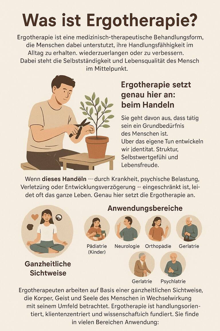 Ergotherapie ist eine medizinisch-therapeutische Behandlungsform, die Menschen dabei unterstützt, ihre Handlungsfähigkeit im Alltag zu erhalten, wiederzuerlangen oder zu verbessern. Dabei steht die Selbstständigkeit und Lebensqualität des Menschen im Mittelpunkt. Der Begriff “Ergo” stammt aus dem Griechischen und bedeutet „Tun, Handeln, Aktivsein“. Ergotherapie setzt genau hier an: beim Handeln.