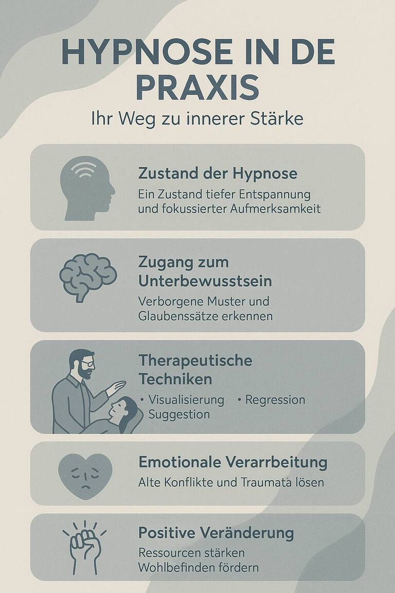 Hypnose behandelt nicht nur Symptome, sondern öffnet den Zugang zu tieferliegenden Ursachen. Sie kann helfen, belastende Erfahrungen neu einzuordnen, emotionale Verletzungen zu heilen und neue Denk- und Handlungsmuster zu entwickeln.